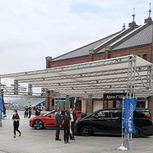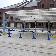 なかでも当社が採用する「トラステント」は、軽量で高強度なアルミ素材を使用し、三角形の骨組み構造「トラス」により設計された、優れた耐久性と柔軟な設営力を誇るテントシステムです。従来のパイプテントでは対応できない大規模空間や特殊な地形にも柔軟に対応でき、展示会・記念式典・屋外催事など幅広いシーンでご活用いただいております。