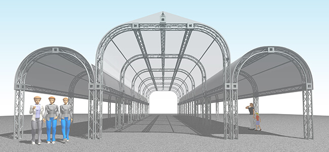 横幅や全長は、パーツの組み合わせによって自由に調整可能なため、さまざまな敷地や用途に柔軟に対応することができます。また、丸みを帯びた優雅なフォルムは、祝祭感を高める演出としても最適で、特にガーデンウェディングなどの特別なシーンにおいて高い評価をいただいております。
