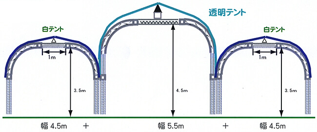 中央の天井の高さは4.5mあり、中央の天井部分が透明テントになっており、光が拡散します。